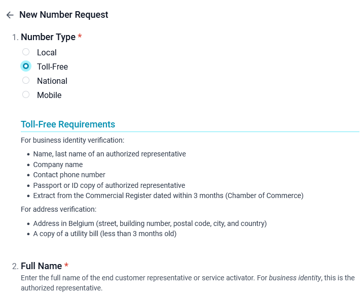 We've updated the form in the support portal for New Number Request to now include specifics on what forms of verification we need to proceed with a number order.