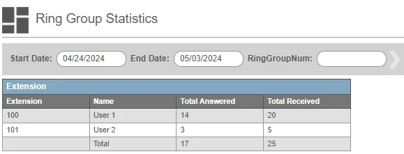 This will give you a simple breakdown of the users who have received calls via ring groups for the defined date range, and how many of those calls they answered. Like the above report you can filter it by RingGroupNum or leave it blank to get all ring groups.