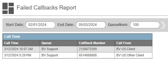 This will give you a list of all calls that have failed callback for your defined date range and queue selection. If you leave the QueueNum field blank, it will show the failed callbacks from all queues.